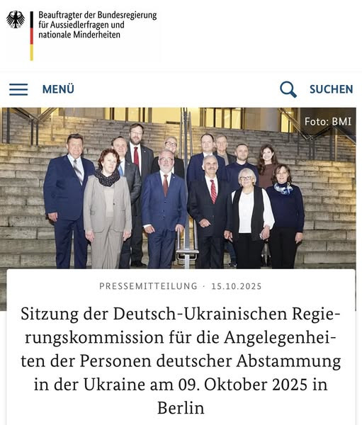 На запрошення Уряду Федеративної Республіки Німеччина 9 жовтня 2025 року в Берліні відбулося дванадцяте засідання Міжурядової українсько-німецької комісії з питань осіб німецького походження, які проживають в Україні. Засідання співголовували проф. д-р Бернд Фабріціус, Уповноважений Федерального уряду Німеччини у справах переселенців та національних меншин, та Віктор Єленський, Голова Державної служби України з етнополітики та свободи совісті.